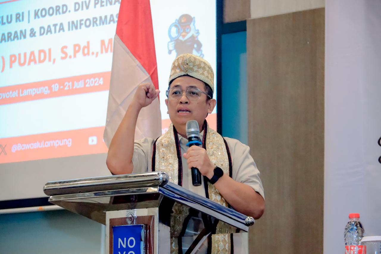 Anggota Bawaslu Puadi memberikan arahan dalam Rapat Kerja Evaluasi Sistem Tata Laksana dan Koordinasi Penanganan Pelanggaran Pemilu Tahun 2024, di Lampung, Kota Bandarlampung, Sabtu (20/7/2024)/foto: Publikasi dan Pemberitaan Bawaslu.