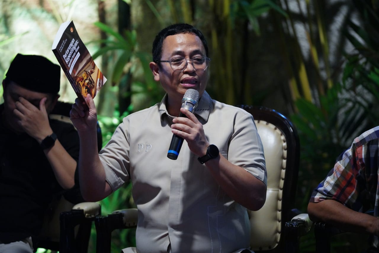 Anggota Bawaslu Puadi saat meluncurkan buku Pertarungan Kepentingan; Interaksi Antar Aktor dalam Pengawasan Pemilu Jakarta, Sabtu (1/11/2025).