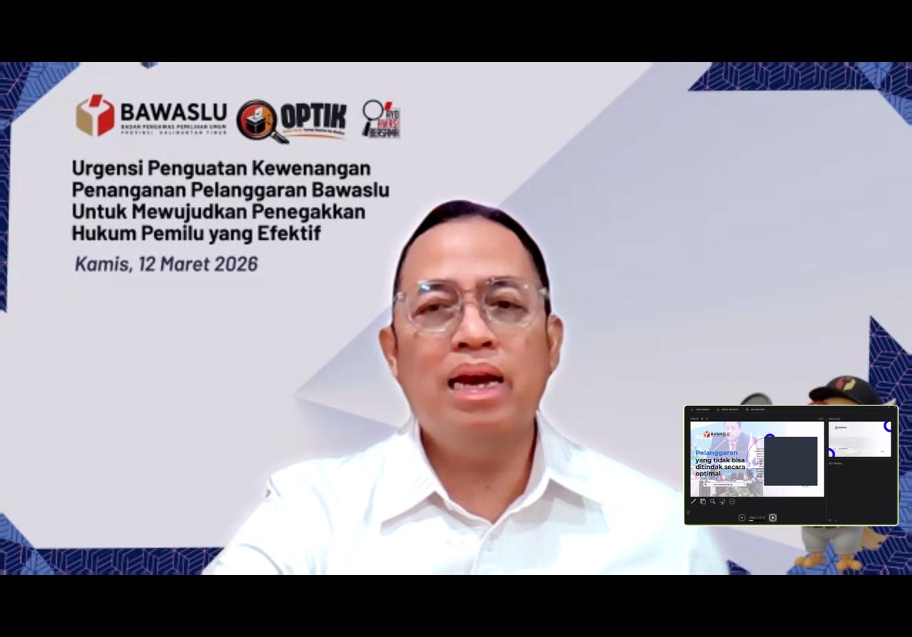 “Pemilu yang jujur dan adil hanya dapat terwujud apabila sistem penegakan hukum pemilu mampu mendeteksi, menindak, dan mencegah pelanggaran secara efektif,” ujar Puadi dalam kegiatan OPTIK: Obrolan Pemilu tentang Integritas dan Keadilan yang diselenggarakan oleh Bawaslu Provinsi Kalimantan Timur melalui Zoom Meeting, Kamis (12/3/2026).
