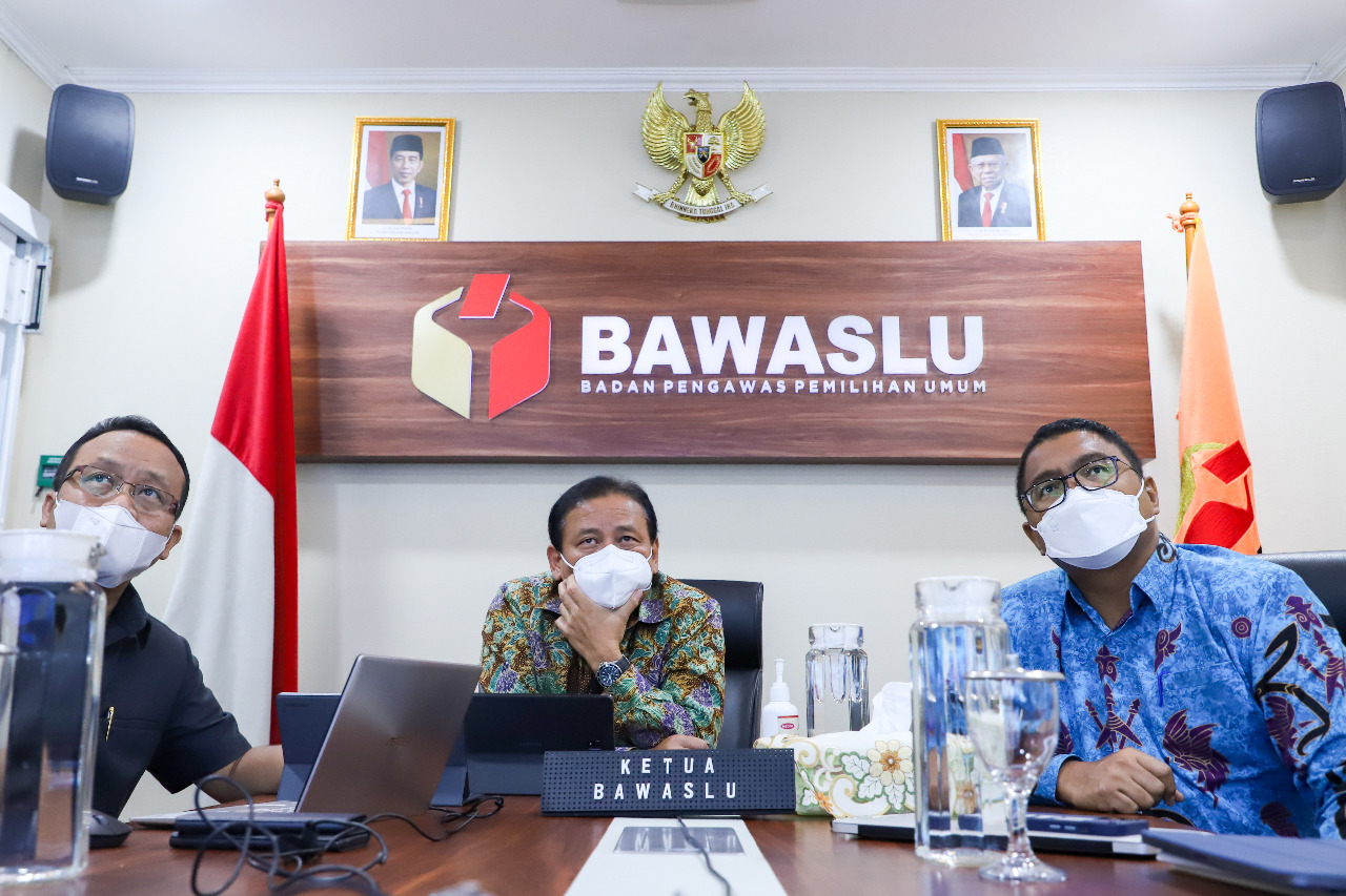 Ketua Bawaslu Abhan (tengah) dan Anggota Bawaslu Fritz Edward Siregar (kanan) saat mengikuti secara daring Rapat Koordinasi Pembahasan Dukungan Penganggaran PSU Pemilihan Bupati/Wakil Bupati Yalimo bersama pejabat dari KPU, Kementrian Keuangan (Kemenkeu), Kementrian Dalam Negeri (Kemendagri), Gubernur Papua, dan Plh Bupati Yalimo, Senin 9 Agustus 2021/Foto: Pemberitaan dan Publikasi Bawaslu RI