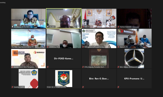 Jakarta, Badan Pengawas Pemilihan Umum- Bawaslu, KPU, Kementrian Keuangan (Kemenkeu), Kementrian Dalam Negeri (Kemendagri), Gubernur Papua, dan Plh Bupati Yalimo melaksanakan rapat koordinasi pemungutan suara ulang (PSU) Pemilihan Bupati dan Wakil Bupati (Pilbup) Yalimo, Provinsi Papua pasca-putusan Mahkamah Konstitusi (MK) Nomor 145/PHP.BUP-XIX/2021. Dalam rapat tersebut Ketua Bawaslu Abhan didampingi Anggota Bawaslu Fritz Edward Siregar yang mengikuti secara daring (dalam jaringan), Senin (9/8/2021) menyampaikan bebera hal penting.