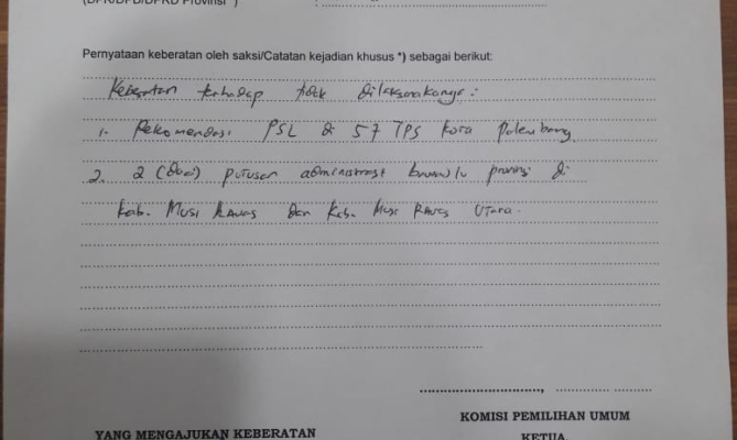 Dalam kesempatan tersebut, Fritz meminta penjelasan KPU Sumsel tekait ihwal tidak dijalankannya rekomendasi dari Bawaslu Sumsel tersebut. Pasalnya, dari 526 rekomendasi PSL, hanya 469 TPS yang dilaksanakan.