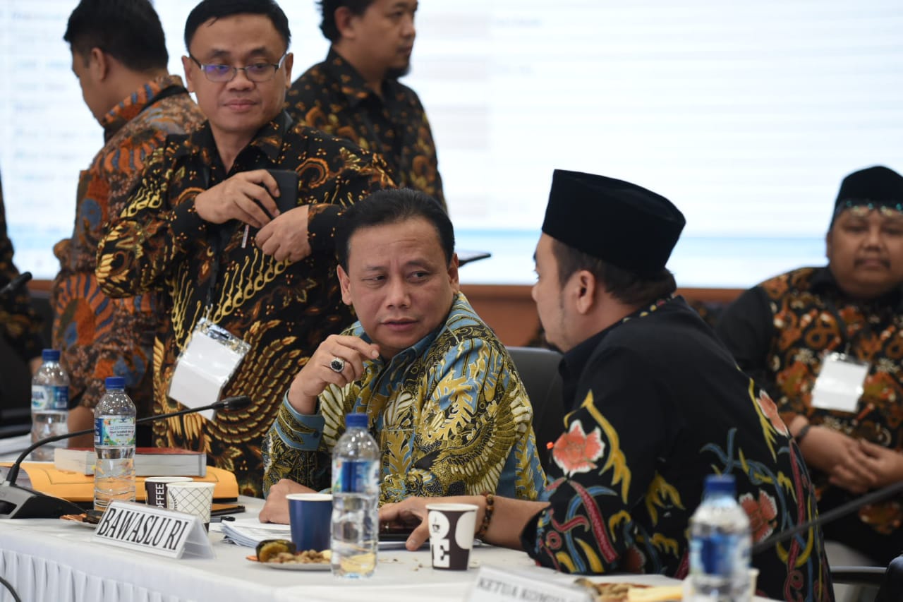 Ketua Bawaslu Abhan berbincang dengan Anggota Bawaslu Mochmad Afifuddin saat proses rekapitulasi suara untuk provinsi Jawa Timur, di kanntor KPU, Selasa 14 Mei 2019/Foto: Abdul Hamid