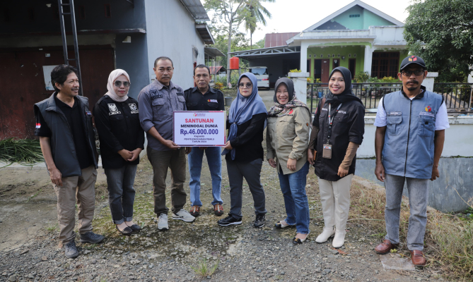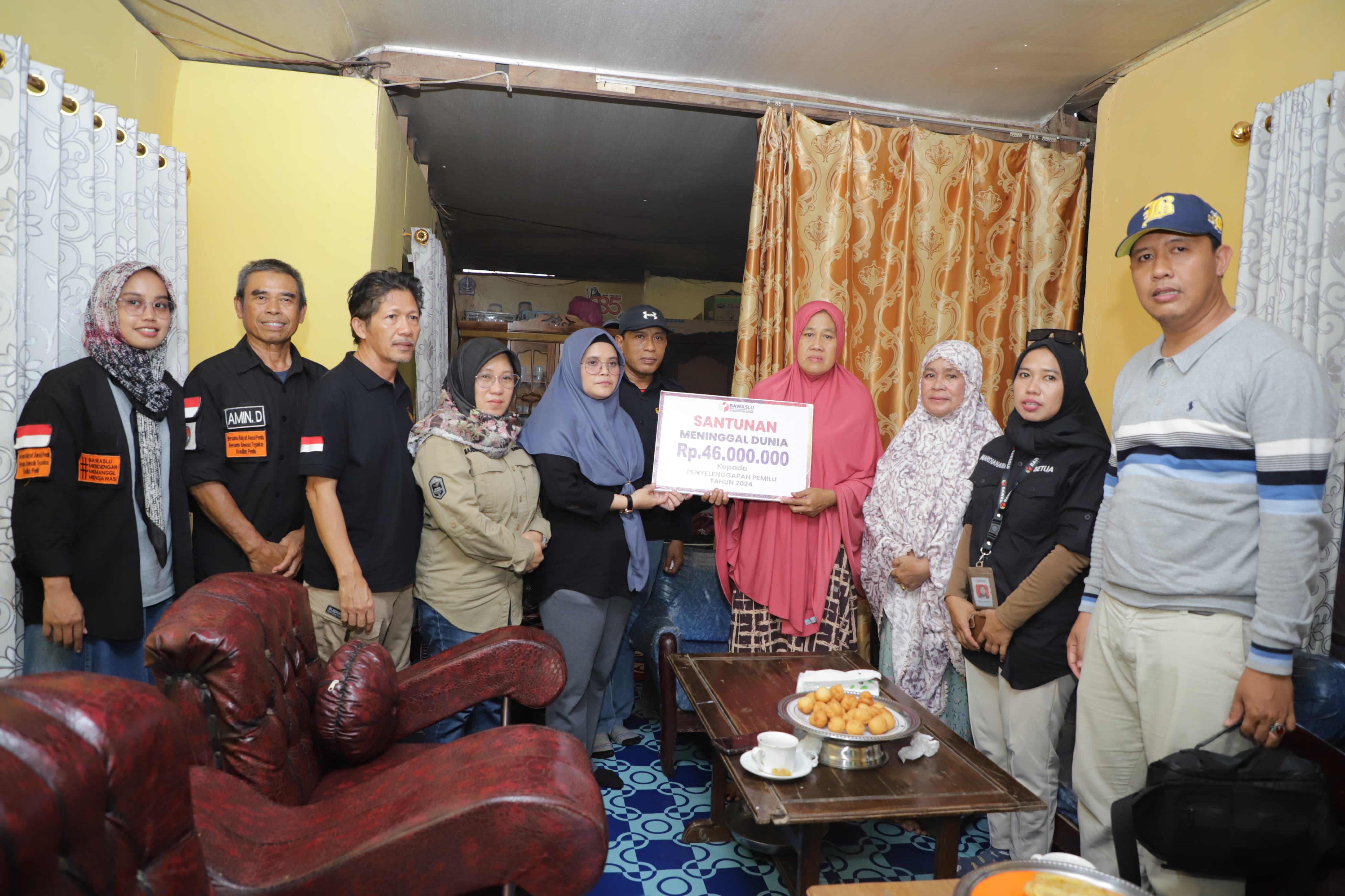 Jajaran pengawas pemilu yang dipimpin Anggota Bawaslu Lolly Suhenty (baju hitam dengan hijab warna biru) saat memberikan santunan kepada keluarga PKD yang telaheninggal dunia di Kabupaten Bone, Sulawesi Selatan, Sabtu (24/2/2024).