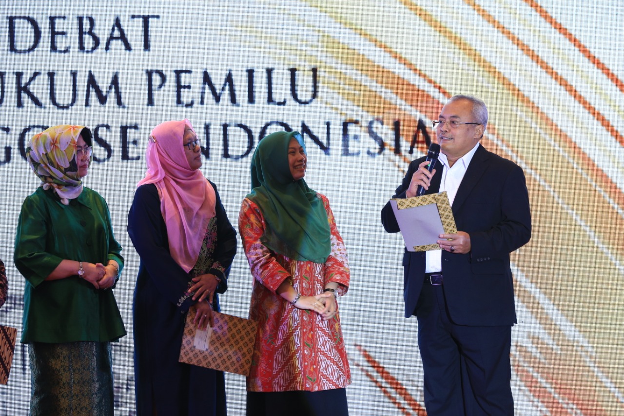 Sekjen Bawaslu Gunawan Suswantoro (kanan) saat menjadi juri Kompetisi Debat Penegakan Hukum Pemilu Antarperguruan Tinggi se-Indonesia Tahun 2019 di Jakarta, Senin (16/12/2019) malam/Foto: Irwan