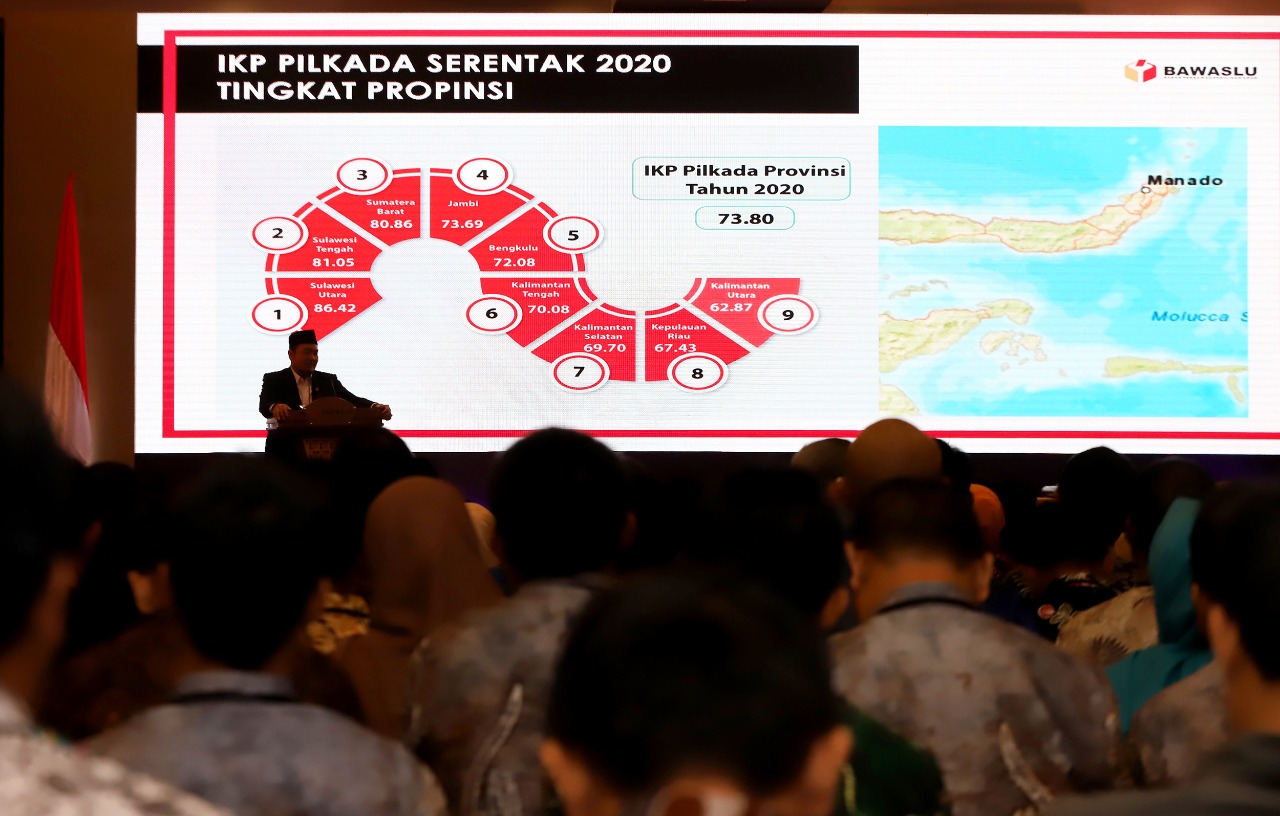 Jakarta, Badan Pengawas Pemilihan Umum - Keseluruhan sembilan provinsi yang menggelar pemilihan gubernur dan wakil gubernur (pilgub) masuk kategori dalam kategori rawan dari hasil Indeks Kerawanan Pemilu (IKP) Pilkada Serentak 2020. Secara berurutan provinsi yang masuk kategori paling rawan, yakni Sulawesi Utara (86,42), diikuti Sulawesi Tengah (81,05), Sumatra Barat (80,86), Jambi (73,69), Bengkulu (72,08), Kalimantan Tengah (70,08), Kalimantan Selatan (69,70), Kepulauan Riau (67,43), dan Kalimantan Utara (62,87).