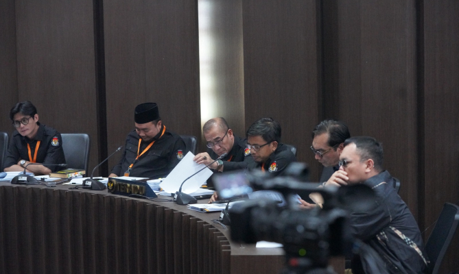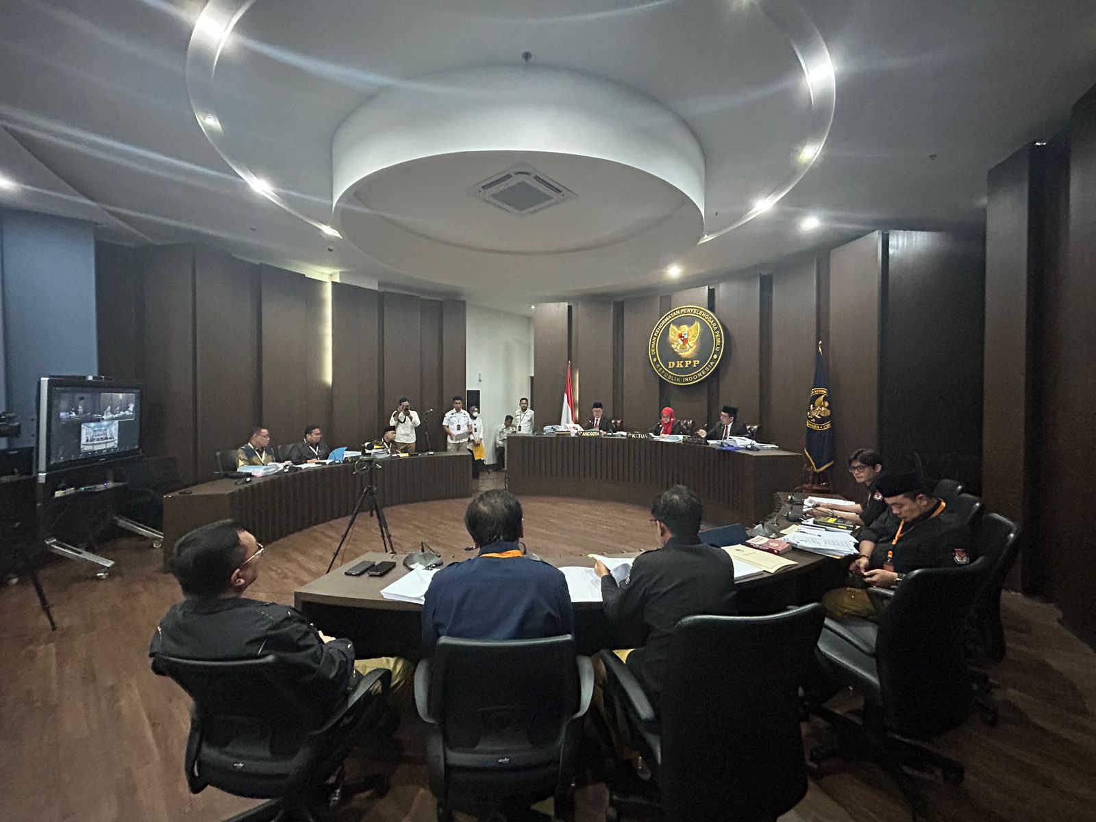 Suasana sidang lanjutan dugaan pelanggaran kode etik akibat pembatasan Silon (Sistem Informasi Pencalon) di DKPP atas aduan Bawaslu dan teradu KPU di Jakarta, Rabu (13/9/2023).