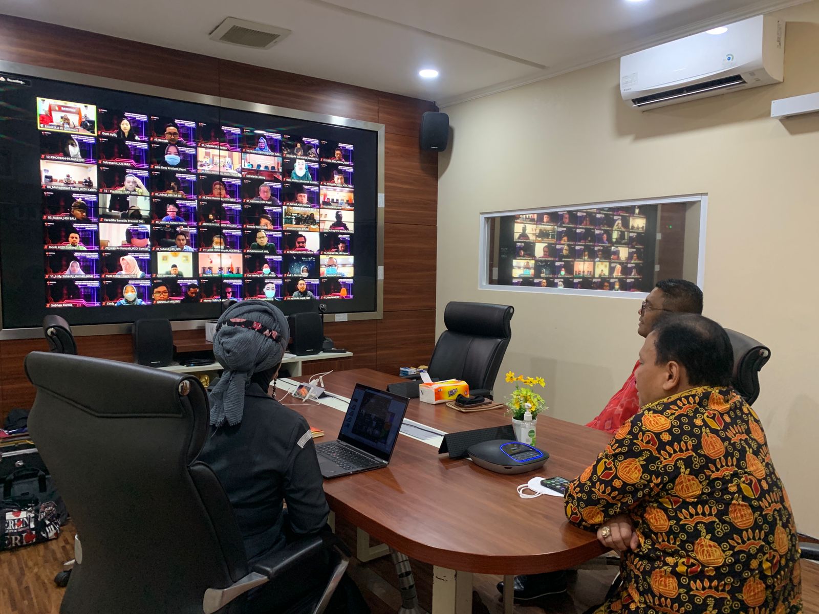 Ketua Bawaslu Abhan (batik oranye) didampingi Anggota Bawaslu Fritz Edward Siregar (batik merah) dan Kapusdatin Lita Gustina menyosialisasikan Perbawaslu SPBE secara virtual, Senin (17/1/2022)/foto: Publikasi dan Pemberitaan Bawaslu.