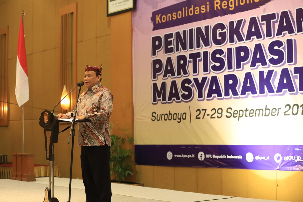 Ketua Bawaslu Abhan saat menjadi narasumber dalam acara Konsolidasi Regional Peningkatan Partisipasi Masyarakat yang diselenggarakan KPU di Surabaya, Jawa Timur, Jumat (27/09/2019) malam/Foto: Irwan