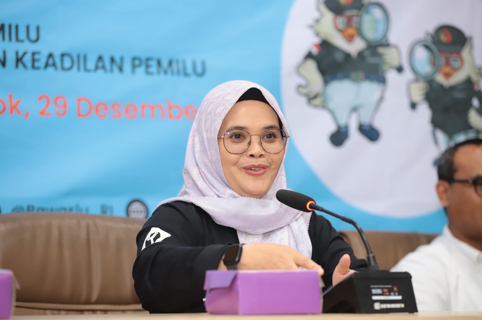 Anggota Bawaslu Lolly Suhenty saat memberikan sambutan dalam Sosialisasi Pengawasan Partisipatif (Soswatif) di kantor Bawaslu Provinsi Nusa Tenggara Barat (NTB), Jumat (29/12/2023).