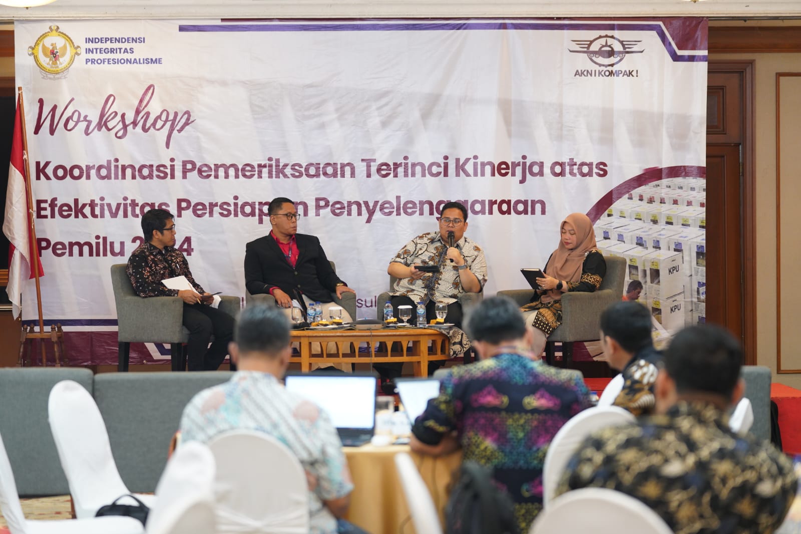 Ketua Bawaslu Rahmat Bagja (kedua dari kanan) menjadi pembicara dalam diskusi bertema Efektifitas Penyiapan Penyelenggaraan Pemilu 2024 yang diselenggarakan oleh Badan Pemeriksa Keuangan (BPK), di Jakarta, Jumat, (8/9/2023)/foto: Publikasi dan Pemberitaan Bawaslu.