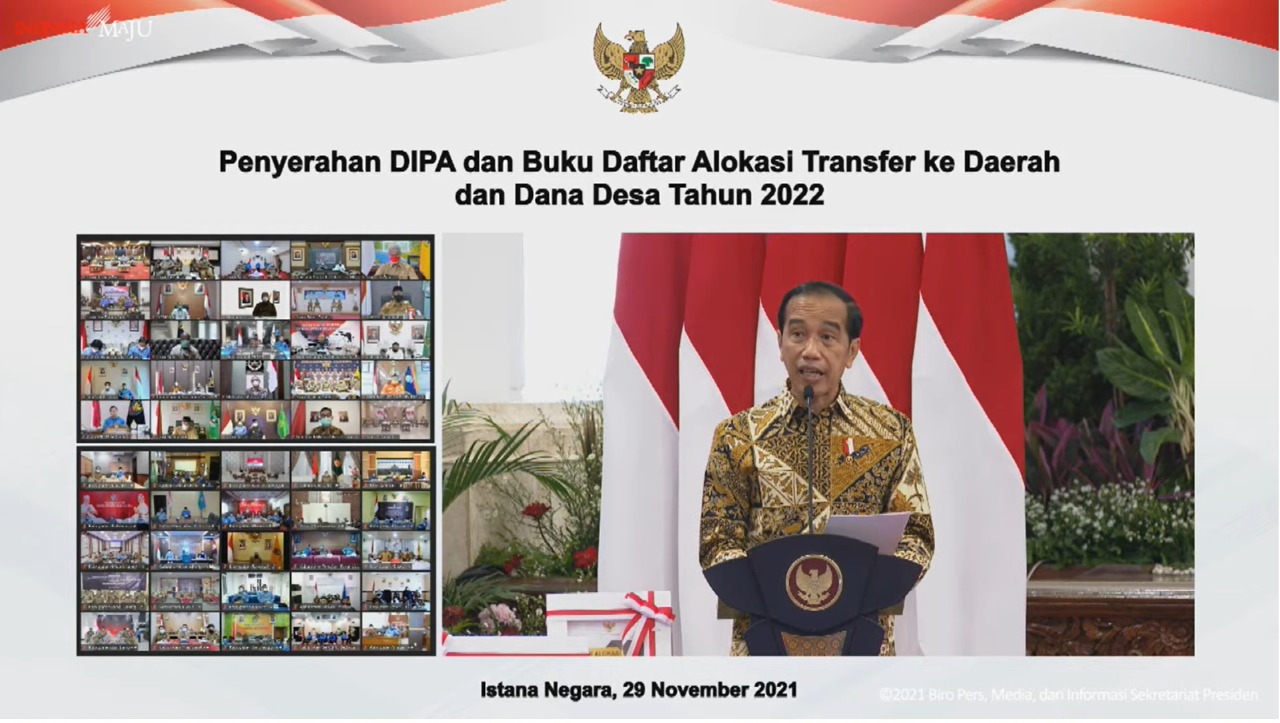 Presiden Joko Widodo, Wakil Presiden Ma'ruf Amin dan Menteri Keuangan resmi menyerahkan Daftar Isian Pelaksanaan Anggaran (DIPA) dan buku daftar alokasi transfer ke daerah dan dana desa tahun 2022, Senin (29/11/2021).