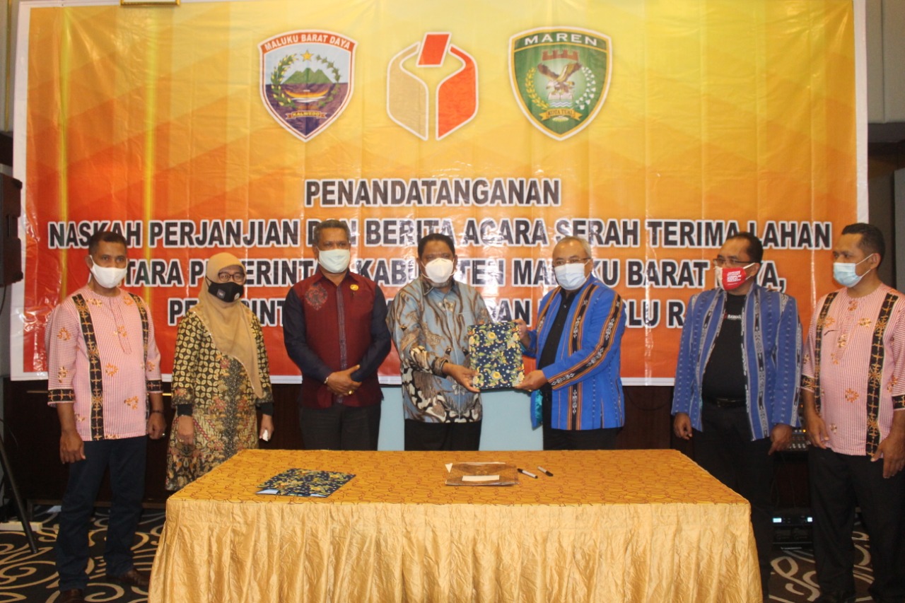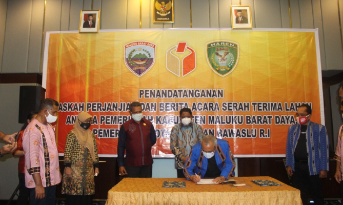 Penandatanganan naskah perjanjian dan berita acara serah terima lahan dari Pemerintah Kota Tual dan Pemerintah Kabupaten Maluku Barat Daya (MBD) ini ditandatangani langsung oleh Sekjen Bawaslu Gunawan Suswantoro dan diserahkan langsung oleh Wali Kota Tual, Adam Rahayaan dan Sekda Kabupaten MBD, Alfonsius Siamiloy.