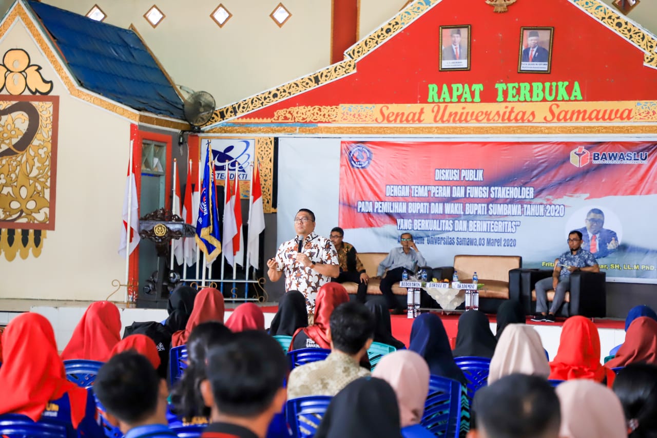Sumbawa, Badan Pengawas Pemilihan Umum - Koordinator Divisi Hukum, Humas, dan Data Informasi Bawaslu Fritz Edward Siregar mengajak mahasiswa Universitas Samawa Sumbawa ikut berpartisipasi aktif dalam Pilkada 2020. Dia meyakini, mahasiswa adalah kelompok terpelajar yang menginginkan kepemimpinan daerah yang berkualitas. Maka, mahasiswa bisa berperan dalam mengawal pilkada yang jujur dan adil.