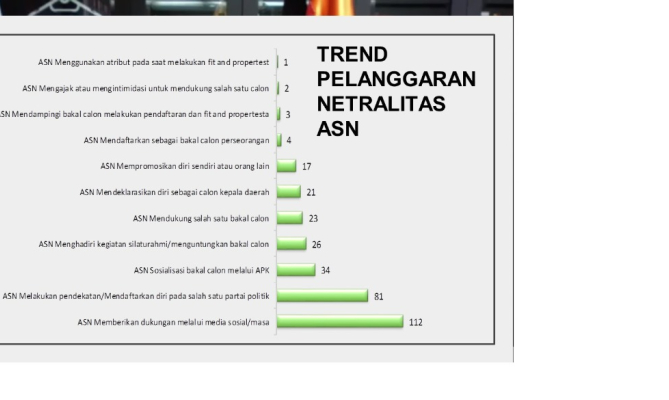 "Jumlah paling banyak pertama yaitu ASN memberikan dukungan melalui medsos atau media massa dengan jumlah 112 pelanggaran. Kedua, ASN melakukan pendekatan atau mendaftarkan diri pada salah satu partai politik dengan jumlah 81 pelanggaran. Dan ketiga, ASN melakukan sosialisasi bakal calon melalui Alat Peraga Kampanye (APK) dengan jumlah 34 pelanggaran," urai dia.