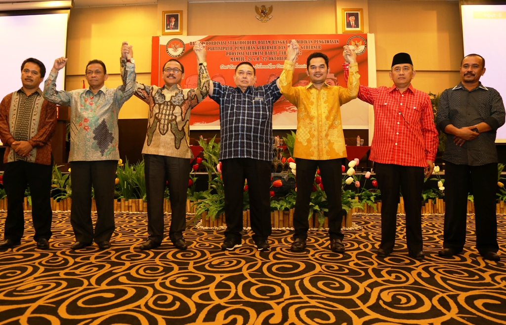 Mamuju, Badan Pengawas Pemilu – Jelang Pemilihan Gubernur dan Wakil Gubernur Tahun 2017 di Provinsi Sulawesi Barat, Bawaslu Provinsi Sulbar dan Bawaslu RI gelar penandatanganan Fakta Integritas bagi calon pasangan Gubernur dan Wakil Gubernur di Provinsi Sulbar. Fakta Integritas tersebut berisi tentang kesiapan pasangan calon untuk mengikuti kompetisi secara sehat tanpa kecurangan. Fakta integritas ini berisikan poin-poin, yakni (1) Tidak memberikan imbalan kepada partai politik maupun gabungan partai politik dalam proses pencalonan kepala daerah; (2) Tidak akan melakukan praktik politik uang; (3) Tidak memanfaatkan atau memobilisasi aparatur sipil negara, pejabat dan karyawan bumd, dan kepala desa untuk kepentingan pemenangan pemilihan; (4) Tidak memanfaatkan program pemerintah daerah untuk kepentingan pemenangan pemilihan; (5) Tidak memanfaatkan fasilitas negara untuk kepentingan pemenangan pemilihan; (6) Tidak menyalahgunakan data kependudukan dan data pemilih untuk kepentingan pemenangan pemilihan; (7) Tidak menyuap, memanfaatkan dan mempengaruhi penyelenggara pemilu; (8) Tidak menggunakan isu-isu black campaign dalam tahapan kampanye hingga pemungutan suara; (9) Apabila terpilih, tidak akan melakukan praktik-praktik korupsi, kolusi, dan nepotisme. Ikrar fakta integritas tersebut dibacakan oleh Pimpinan Bawaslu RI Nasrullah dan dikuti oleh penyelenggara pemilu (jajaran Bawaslu Provinsi Sulbar dan jajaran KPU Provinsi Sulbar), bakal pasangan calon, dan seluruh peserta Rakor Stakeholder, Jumat (21/10) malam di Hotel Maleo Mamuju, Sulawesi Barat. Pembacaan ikrar dimaksudkan untuk mewujudkan pesta demokrasi yang damai, lancar, jujur tanpa ada interpensi dari pihak manapun juga. Sebelum pembacaan Ikrar Fakta Integritas, Ketua Bawaslu RI Muhammad menegaskan dan menyakinkan para calon pasangan, tim sukses, dan masyarakat Sulbar bahwa penyelenggara pemilu akan netral tanpa pandang bulu. “Jika ada jajaran Bawaslu yang terindikasi tidak netral, akan dipastikan dengan kewenangan Bawaslu RI akan segera dipecat dan dipidanakan”, tegas Muhammad. Mengingat besarnya harapan masyarakat Sulbar terhadap Pemilhan Gubernur Tahun 2017 ini. Jajaran pengawas Pemilu siap mempertaruhkan harga diri lembaga pengawas Pemilu. "Ini komitmen kami, tidak akan membiarkan seorangpun berluku curang di Pilkada Sulbar. Kami (Bawaslu RI) akan mengawal Pilkada Sulbar”, tegas Muhammad Muhammad menambahkan, meskipun Provinsi Sulbar tergolong provinsi muda, tapi Bawaslu ingin Sulbar menjadi contoh yang bisa menghadirkan proses pemilu yang damai, transparan, akuntabel, dan bisa diterima oleh semua pihak. Serta memastikan pemenang dalam kotak suara sama dengan yang diumumkan oleh KPU. “Gubernur dan Wakil Gubernur Sulbar yang dilantik adalah sesuai dengan pilihan rakyat. Bukan orang yang tidak berhak dilantik disebabkan kecurangan yang dilakukannya”, ujar Muhammad. Selain itu, Muhammad mengingatkan, bahwa sukses Pilkada Sulbar bukan semata-mata menjadi tanggung jawab Bawaslu dan KPU melainkan semua profesi masyarakat di Sulbar mempunyai tanggung jawab terhadap sukses tidaknya proses penyelenggaran Pemilu di Sulbar. Untuk itu, kami (pengawas Pemilu) meminta partisipasi seluruh masyarakat Sulbar untuk memberikan informasi terkait potensi kecurangan yang terjadi. Apalagi jika sudah menjadi kecurangan. “Bantu penyelenggara untuk memberikan harga diri Pilkada ini," pungkas Muhammad. Penulis/Foto: Muhtar