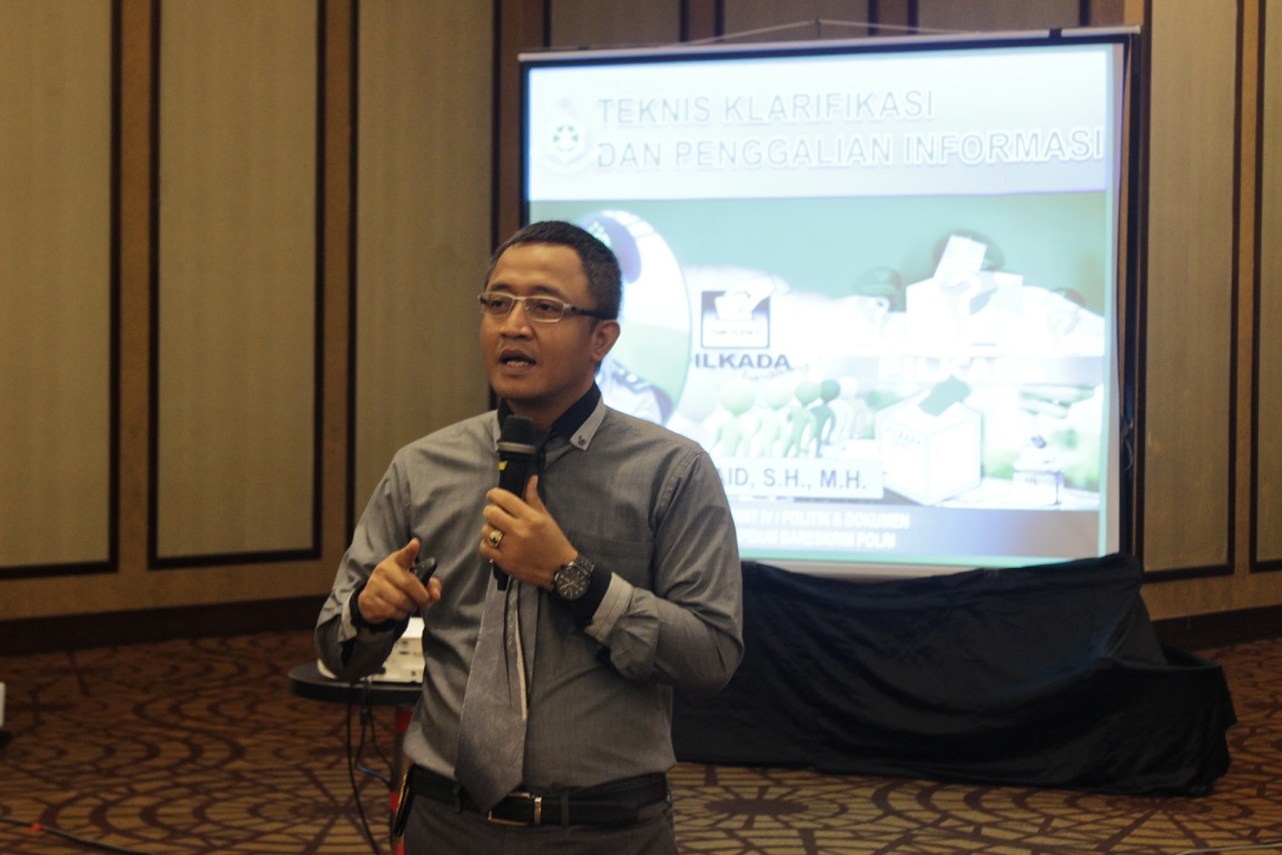 Kompol Nur Said dari Bareskrim Polri memberikan gambaran terkait upaya penanganan tindak pidana yang juga berkaitan dengan penanganan pelanggaran Pemilu dalam Acara Rapat Kerja Teknis Penanganan Pelanggaran Pilkada Tahun 2015 bagi para Bawaslu Provinsi dan Panwaslu Kabupaten/Kota, Kamis (2/7).