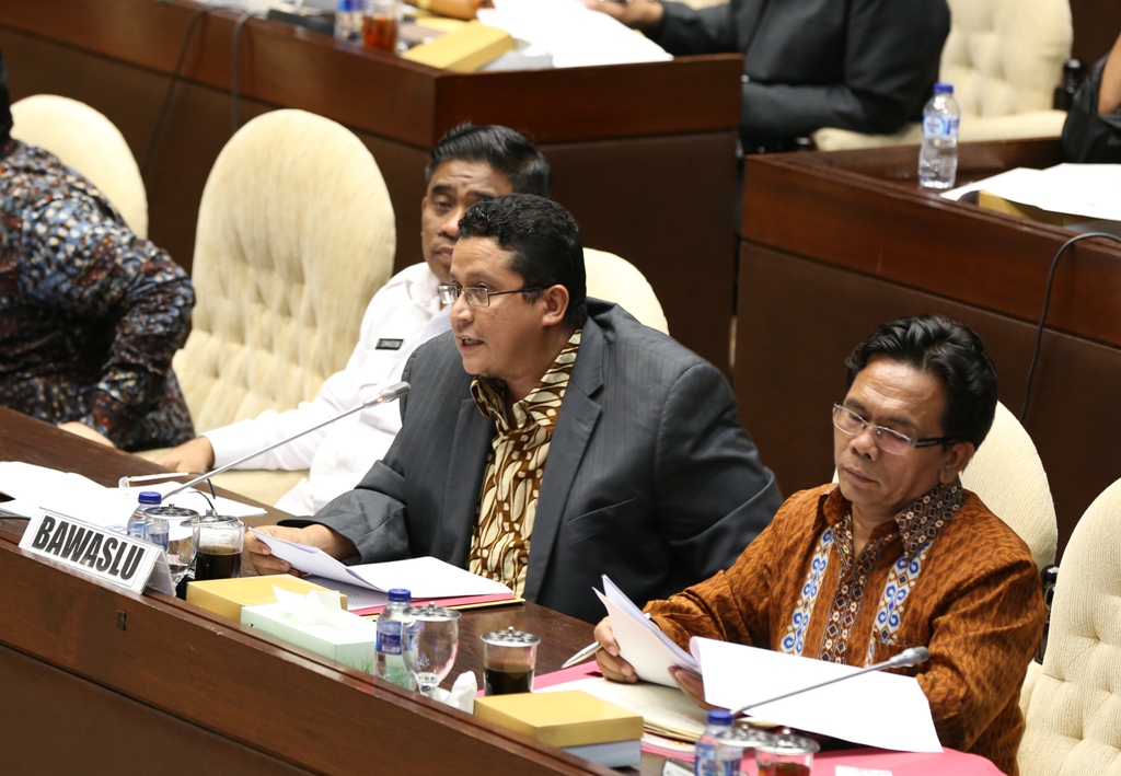 Jakarta – Badan Pengawas Pemilihan Umum – Ketua Bawaslu RI Muhammad didampingi Pimpinan Bawaslu RI, Nasrullah, Nelson Simanjuntak, dan Daniel Zuchron, memberikan beberapa masukan yang perlu diperhatikan oleh KPU pada  Peraturan Komisi Pemilihan Umum (PKPU) Tentang  Pilkada 2017. Hal ini disampaikan pada Rapat Dengar Pendapat (RDP) pembahasan Rancangan Peraturan Komisi Pemilihan Umum tentang Tahapan, Program dan Jadwal pada Penyelenggaraan Pilkada Tahun 2017 dengan Komisi II DPR RI, KPU,  dan Dirjen Otda Kemendagri di Gedung DPR RI Rabu Malam (16/3).