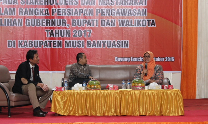 Musi Banyuasin, Badan Pengawas Pemilu- Sekitar seratus masyarakat yang terdiri dari berbagai elemen masyarakat Kecamatan Bayung Lencir Kabupaten Musi Banyuasin (Muba) Sumatera Selatan mengikuti Sosialisasi Tatap Muka Kepada Stakeholders Dan Masyarakat Dalam Rangka Persiapan Pengawasan Pemilihan Gubernur, Bupati, dan Walikota tahun 2017 di Kabupaten Musi Banyuasin, Kamis (13/10).  Masyarakat yang tampak antusias mengikuti sosialisasi ini didorong untuk bisa menjadi masyarakat yang aktif dalam mengawasi jalannya Pilkada di Muba.