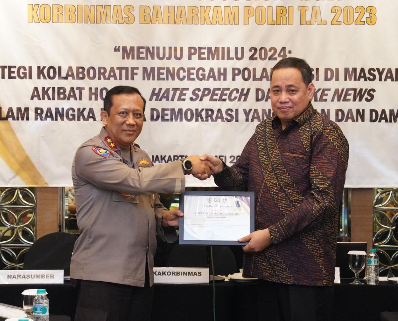 Anggota Bawaslu Herwyn JH Malonda (kanan) saat menjadi narasumber di dalam diskusi yang digelar Korps Pembinaan Masyarakat Baharkam Polri di Jakarta, Rabu, (24/5/2023).