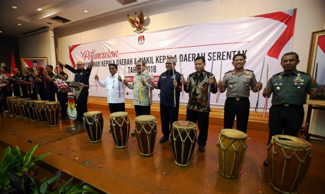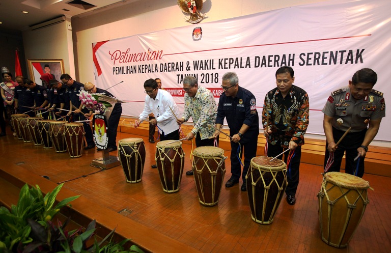 Jakarta, Badan Pengawas Pemilu- Bertempat di Ruang Sidang Utama Gedung KPU RI, Jl. Imam Bonjol Menteng, Jakarta Pusat, Rabu (14/6), KPU RI resmi meluncurkan Tahapan Pemilihan Kepala Daerah dan Wakil Kepala Daerah Serentak tahun 2018. Ketua Bawaslu RI Abhan, Dirjen Otonomi Daerah Sonni Sumarsono, Wassintel TNI AD Brigjen Andjar Wiraatma, serta Asops Mabes Polri Irjen Pol Unggung Cahyono yang turut hadir dalam peluncuran Tahapan Pilkada 2018 turut memukul perkusi bersama Ketua dan Anggota KPU RI sebagai tanda diluncurkannya Tahapan Pilkada 2018.