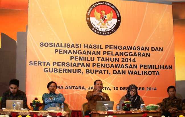 Jakarta, Badan Pengawas Pemilu – Badan Pengawas Pemilu (Bawaslu) menyampaikan hasil Pengawasannya kepada publik, di Jakarta, Rabu (10/12). Dalam paparannya, Bawaslu menyampaikannya dalam rangka ingin mendapat masukkan dari masyarakat untuk perbaikan pengawasan pemilihan Gubernur, Bupati, dan Walikota pada 2015 mendatang.
