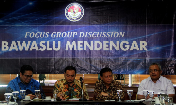Jakarta, Badan Pengawas Pemilu - Bawaslu RI kembali menggelar diskusi kelompok terarah Bawaslu Mendengar Tahap II dengan mengundang partai politik (parpol), organisasi masyarakat (ormas) dan Komite I Dewan Perwakilan Daerah Republik Indonesia di The Media Hotel, Jakarta, Rabu (3/5). Hadir dalam kegiatan ini Ketua Bawaslu RI Abhan, Anggota Bawaslu RI Mochammad Afifuddin dan Rahmat Bagja, serta Sekretaris Jenderal Bawaslu RI Gunawan Suswantoro.