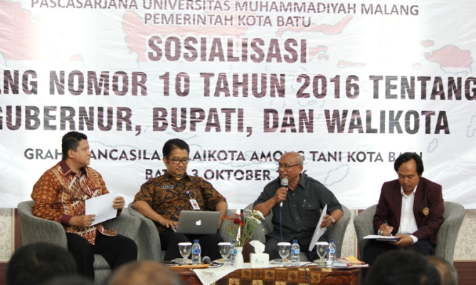 Batu, Badan Pengawas Pemilu – Ketua Bawaslu RI Prof. Dr. Muhammad, S.IP., M.Si menghadiri undangan kegiatan Sosialisasi Undang – Undang Nomor 10 Tahun  2016 Tentang Pemilihan Gubernur, Bupati dan Walikota yang diselenggarakan oleh Research and Consultant Pemantau dan Evaluasi Otonomi Daerah bersama Pascasarjana Universitas Muhammadiyah Malang (UMM) dan Pemerintah Kota Batu di Gedung Graha Pancasila Balaikota Among Tani Pemkot Batu, Senin (03/10).