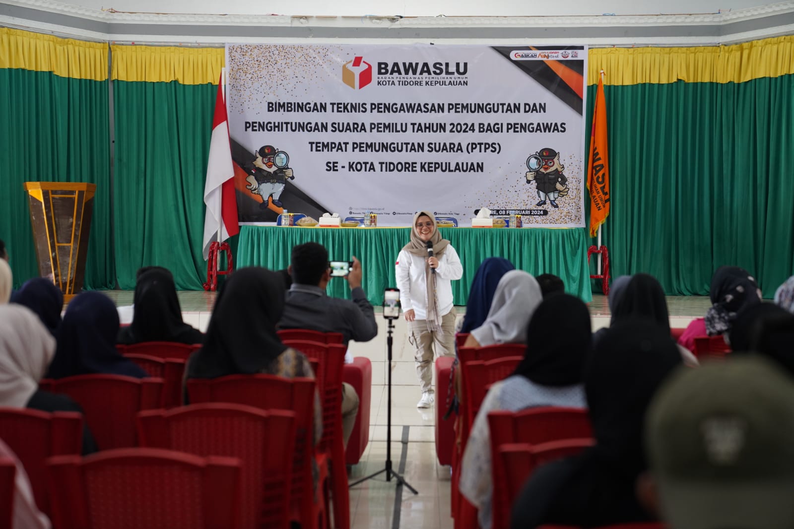Anggota Bawaslu Lolly Suhenty saat membuka Bimtek bagi PTPS se-Kota Tidore Kepulauan, Jumat (9/2/2024).
