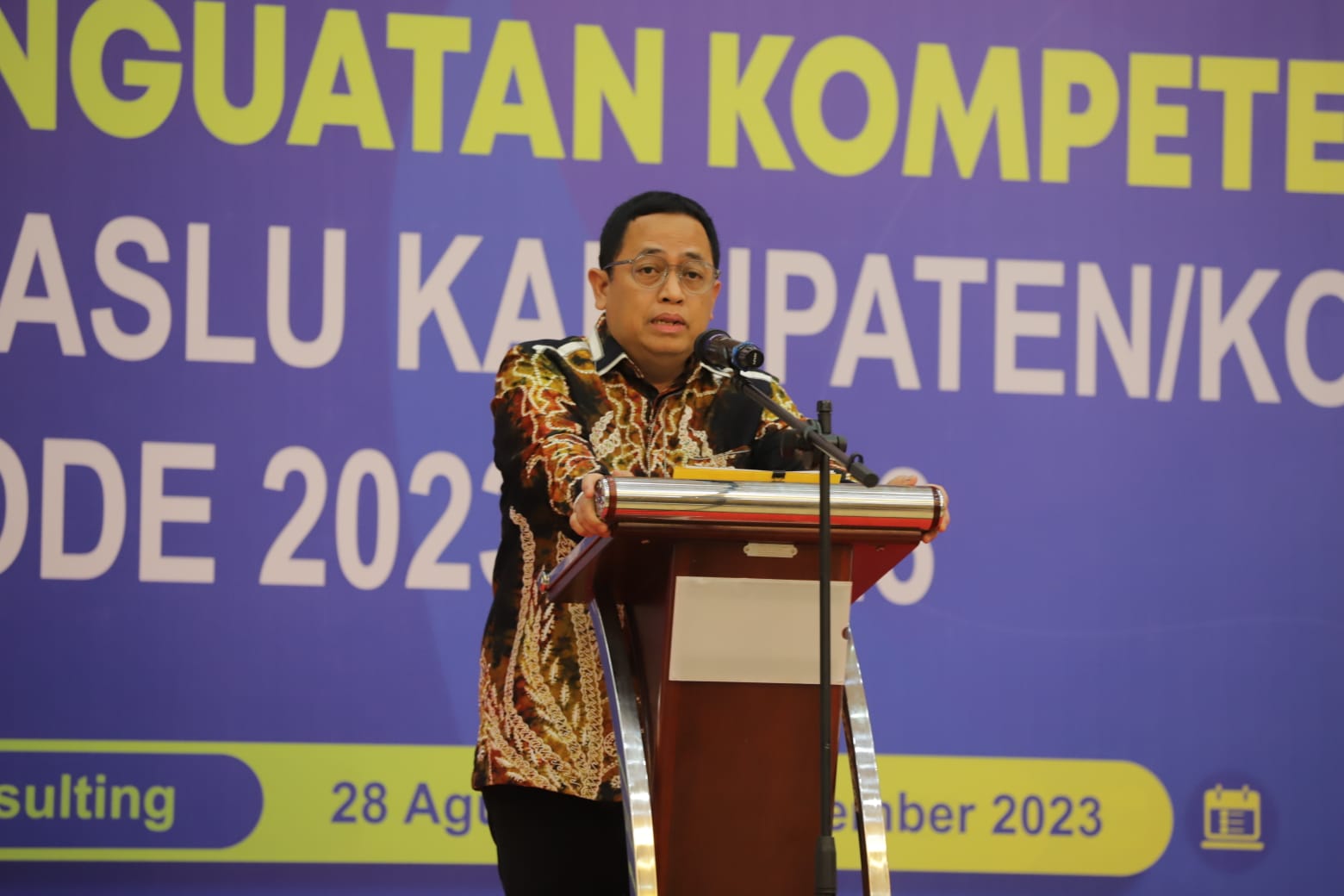 Bogor, Badan Pengawas Pemilihan Umum - Anggota Bawaslu Puadi meminta jajaran Bawaslu Kabupaten/Kota yang baru terpilih, bekerja sesuai dengan prinsip-prinsip penyelenggaraan pemilu, bekerja tanpa ada misi apapun. Hal itu disampaikan Puadi saat membuka Pelatihan Penguatan Kompetensi Anggota Bawaslu Kabupaten/Kota Batch 2, Senin (28/8/2023).