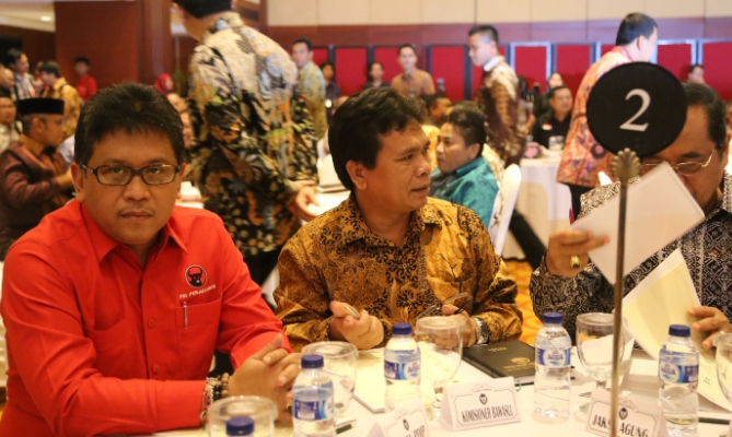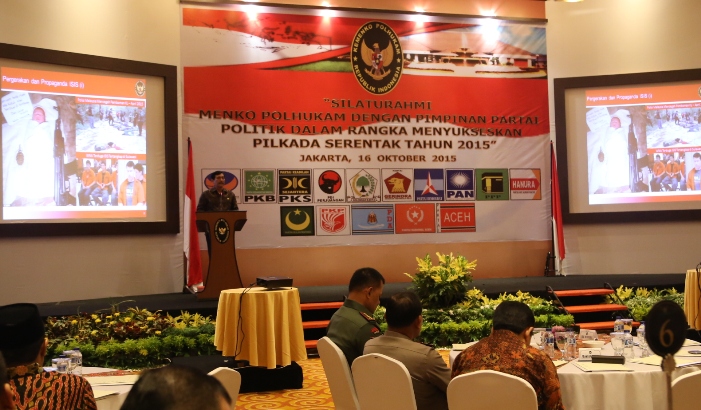 This meeting involved the political party elites who are members of Koalisi Merah Putih (KMP), or from Koalisi Indosia Hebat (KIH). The topic of this meeting was the "Gathering of Coordinating Minister for Political, Legal and Security Affairs with Political Party leaders in order to succeed the Simultaneous Election for Local Leaders 2015".
