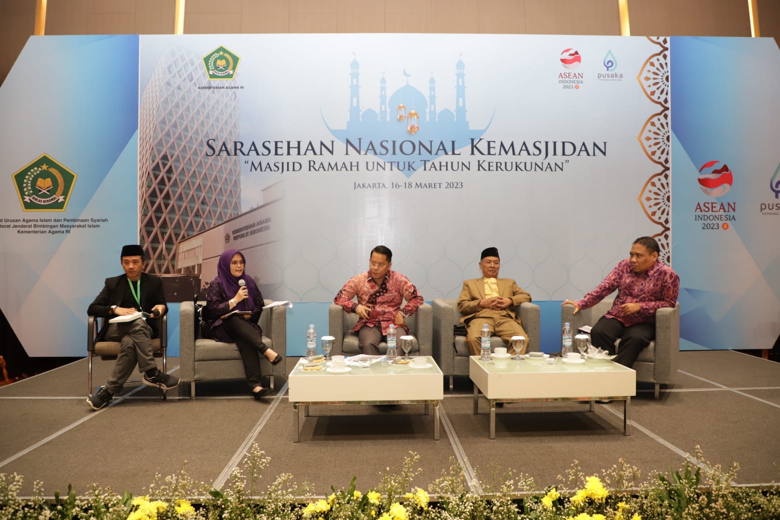Anggota Bawaslu Lolly Suhenty (busana warna ungu) dalam 'Sarasehan Kemasjidan Tahun 2023' yang digelar Direktorat Jenderal Bimbingan Masyarakat Kementerian Agama (Kemenag), di Jakarta, Jumat (17/3/2023).