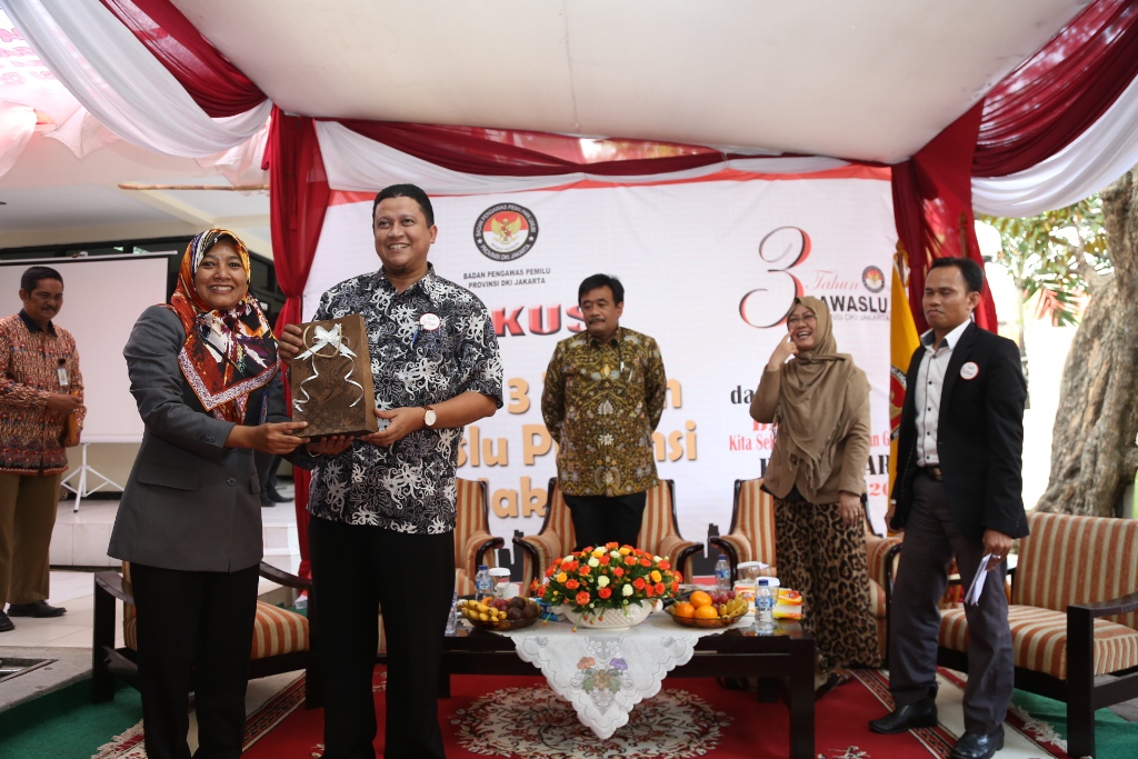Chairman of Election Supervisory Board of Indonesia, Muhammad, received a souvenir from the Chairman of Jakarta Provincial Election Supervisory Board, Mimah Susanti in a discussion held by the Jakarta Provincial Election Supervisory Board with the topic "Reflections on Monitoring of Election of President and Vice-President 2014, Towards the Monitoring of Election of Governor of the Special Capital City Region of Jakarta Province 2017, and at the same time to commemorate the 3rd anniversary of the Jakarta Provincial Election Supervisory Board, in Jakarta, Friday (16/10)
