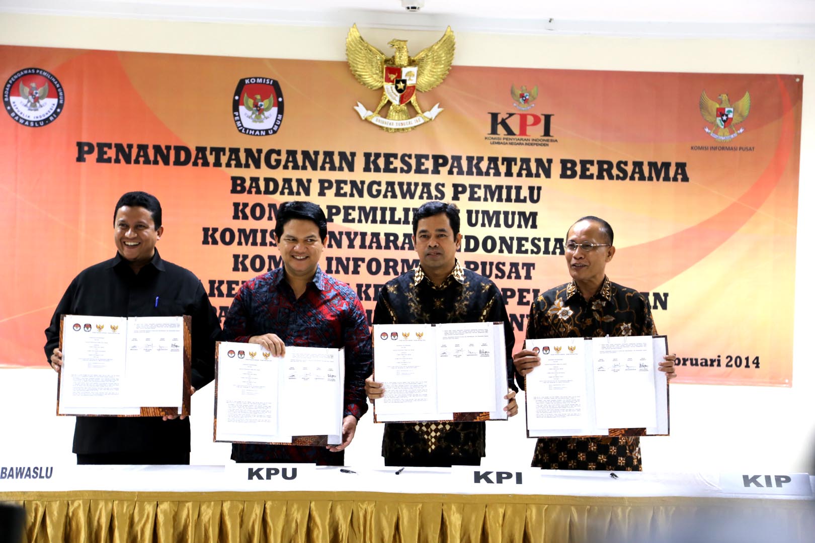 Jakarta, Bawaslu – Setelah mendapat dukungan dari Komisi I DPR terkait penertiban iklan kampanye di media elektronik, empat lembaga negara yakni Badan Pengawas Pemilu (Bawaslu), Komisi Pemilihan Umum (KPU), Komisi Penyiaran Indonesia (KPI) dan Komisi Informasi Pusat (KIP) akhirnya menandatangani Surat Keputusan Bersama (SKB) tentang kepatuhan ketentuan pelaksanaan kampanye melalui media penyiaran.