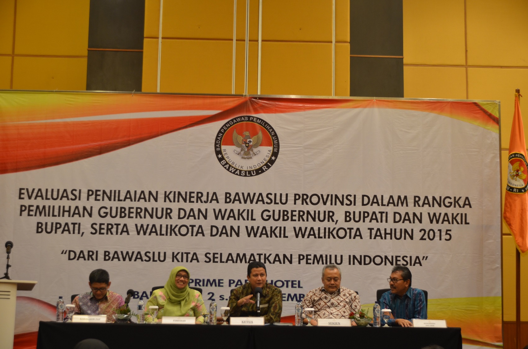 Bandung, Badan Pengawas Pemilu – Dalam rangka meningkatkan kontrol kinerja Bawaslu provinsi guna mewujudkan penyelenggaraan pengawasan Pilkada yang efektif, efisien, akuntabel, profesional, dan harmonis, Bawaslu RI menggelar Rapat Kerja Penilaian Kinerja Bawaslu Provinsi dalam Penyelenggaraan Pemilu Gubernur dan Wakil Gubernur, Bupati dan Wakil Bupati, serta Walikota dan Wakil Walikota Tahun 2015 di Bandung, Jumat (2/12) hingga Minggu (4/12).