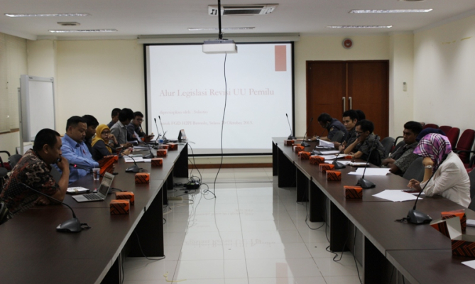 Jakarta, Election Supervisory Board - In response to the planned revision of the Election Law which will be incorporated into the National Legislation Program (Prolegnas) 2016, the Election Supervisory Board of the republic of Indonesia held a focused group discussion (FGD) on the revised plan to provide some sort of input or recommendation. It was held in the Meeting Room, 4th Floor, Office of Election Supervisory Board of the Republic of Indonesia, which was planned to be conducted eight times by presenting several speakers for the discussion, namely Muhammad Afiffuddin from Jaringan Pendidikan Pemilih untk Rakyat, Sulastio from Indonesia Parliamentary Centre, and political observer August Melaz.