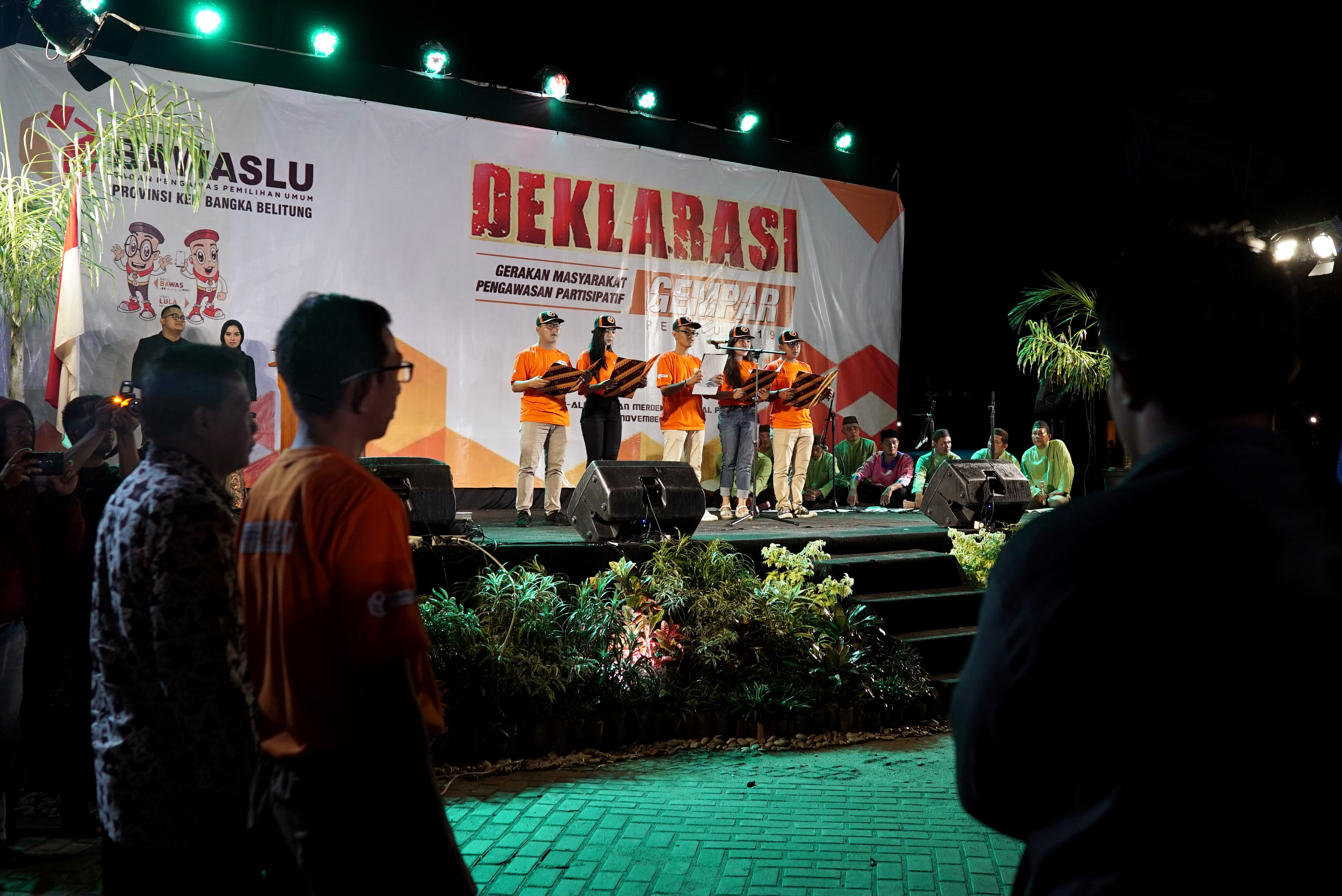 Ketua Bawaslu Abhan dan Ketua Bawaslu Bangka Belitung Edi Irawan (kiri bawah) menyaksikan Duta Relawan membacakan Deklarasi Gerakan Masyarakat Pengawasan Partisipatif (Gempar) Pemilu 2019 di Kota Pangkal Pinang, Provinsi Kepulauan Bangka Belitung, Sabtu (3/11/2018) malam.