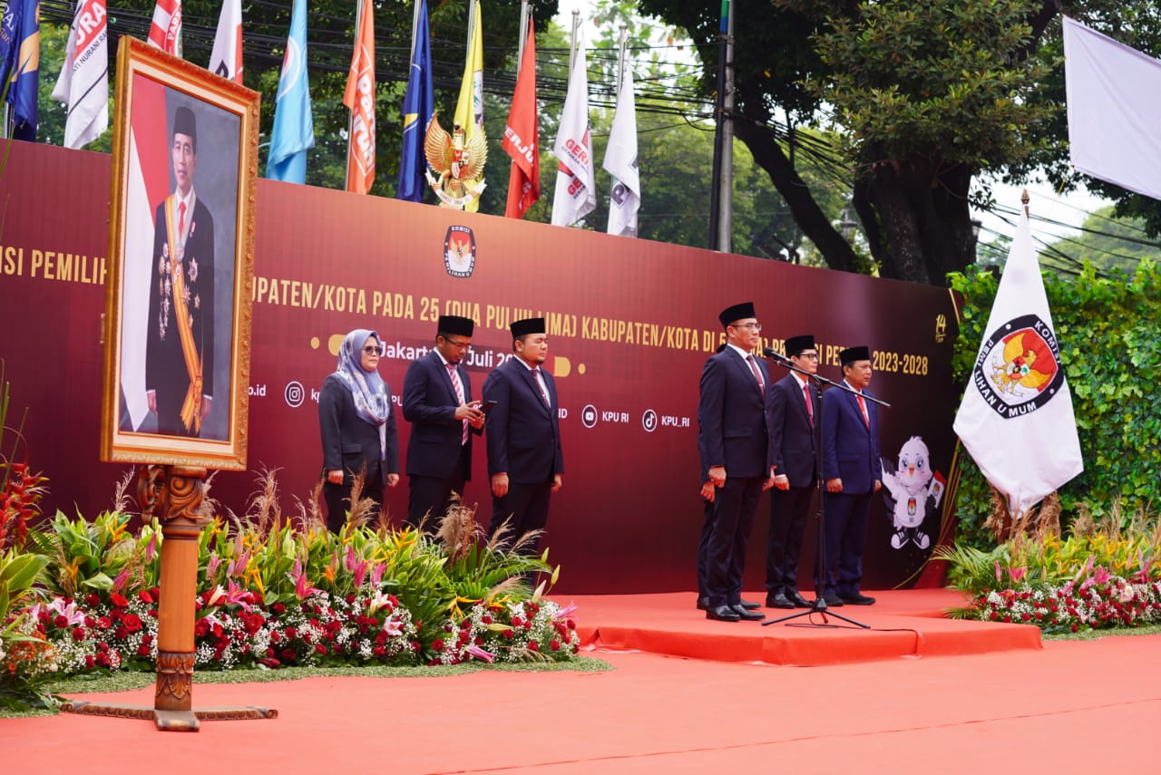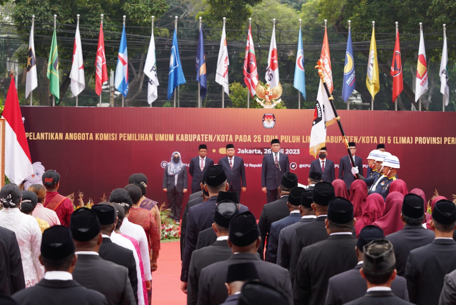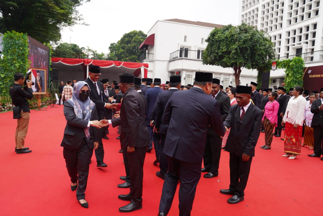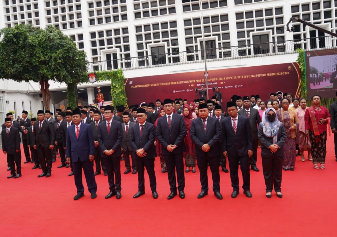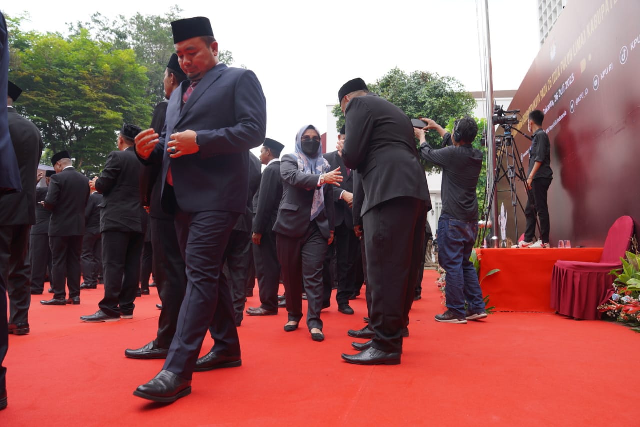 Anggota Bawaslu Lolly Suhenty menghadiri pelantikan Anggota KPU Kabupaten/Kota dari 25 provinsi di Kantor KPU, Jakarta, Rabu (26/7/2023).