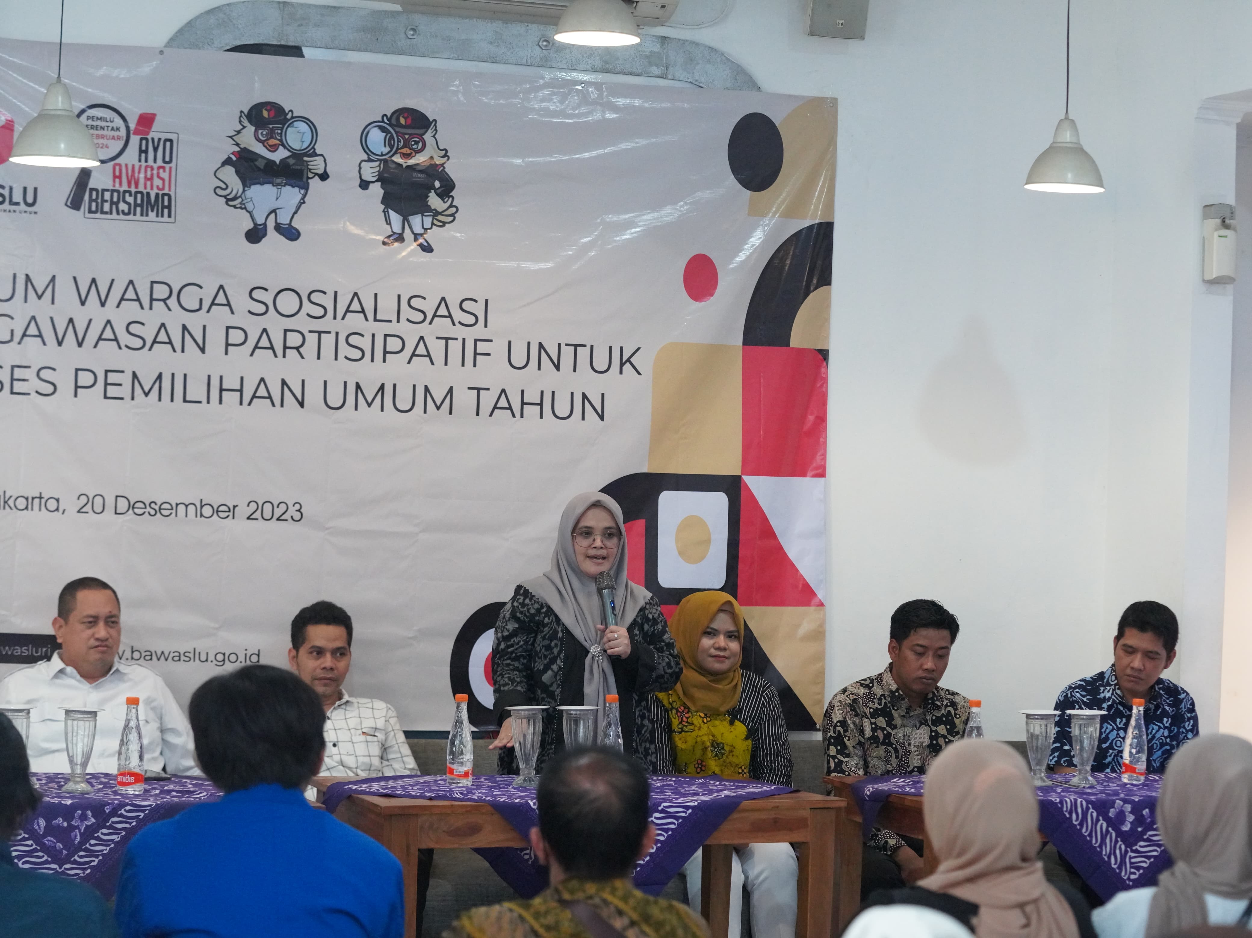 Anggota Bawaslu Lolly Suhenty saat menghadiri Forum Warga Sosialisasi Pengawasan Partisipatif (Soswatif) untuk Sukses Pemilu Tahun 2024 yang berlangsung di Kabupaten Purwakarta, Jawa Barat, Rabu (20/12/2023).