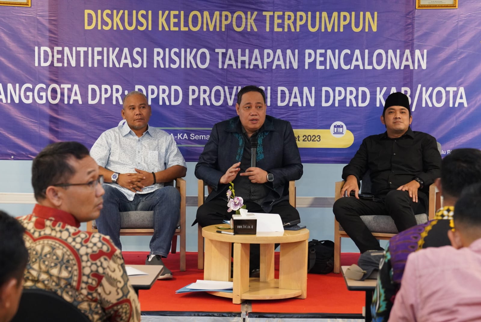 Semarang, Badan Pengawas Pemilihan Umum - Anggota Bawaslu Herwyn JH Malonda berharap Identifikasi Risiko Tahapan Pencalonan Anggota DPR; DPRD Provinsi dan DPRD Kabupaten/Kota segera rampung. Hal tersebut dikatakan Herwyn saat menutup Diskusi Kelompok Terpumpun yang digelar oleh Pusat Penelitian, Pengembangan, Pendidikan, dan Pelatihan (Puslitbangdiklat) Bawaslu di Semarang, Jawa Tengah, Kamis (31/3/2023).u KPU menyusun PKPU pencalonan," ungkapnya.