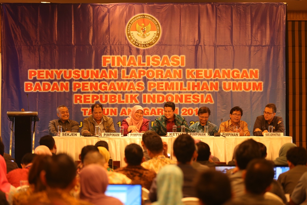 (kiri-kanan) Sekjen Bawaslu RI Gunawan Suswantoro, Pimpinan Bawaslu RI, Nasrullah, Endang Wihdatiningtyas, Muhammad (Ketua), Daniel Zuchron, Nelson Simanjuntak, Kepala Biro Adminitrasi Dermawan Adhi Santoso pada acara pembukaan Finaslisasi Penyusunan Laporan Keuangan Badan Pengawas Pemilihan Umum Republik Indonesia Tahun Anggaran 2015, bertempat di Hotel Arya Duta, Jakarta. Senin 1 Februari 2016.