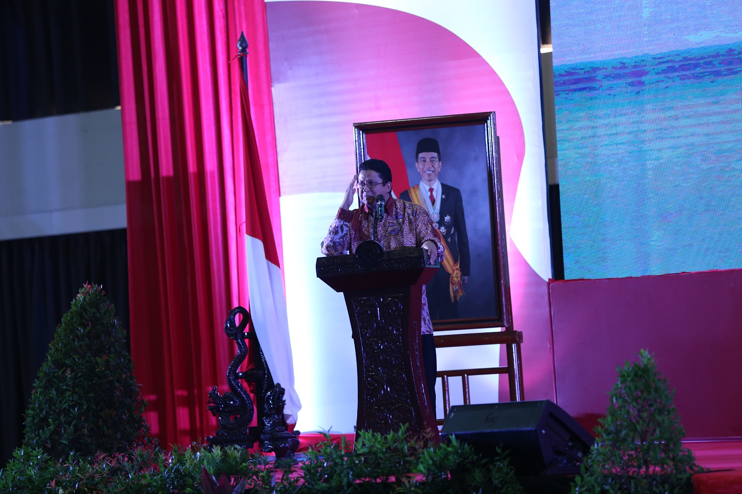 Ketua Bawaslu RI memberikan materi kepada para peserta Rapat Koordinasi Nasional Pemantapan Pelaksanaan Pilkada Serentak Tahun 2015. Muhammad mengharapkan para pihak untuk mendorong pasangan calon untuk berkompetisi secara sehat.