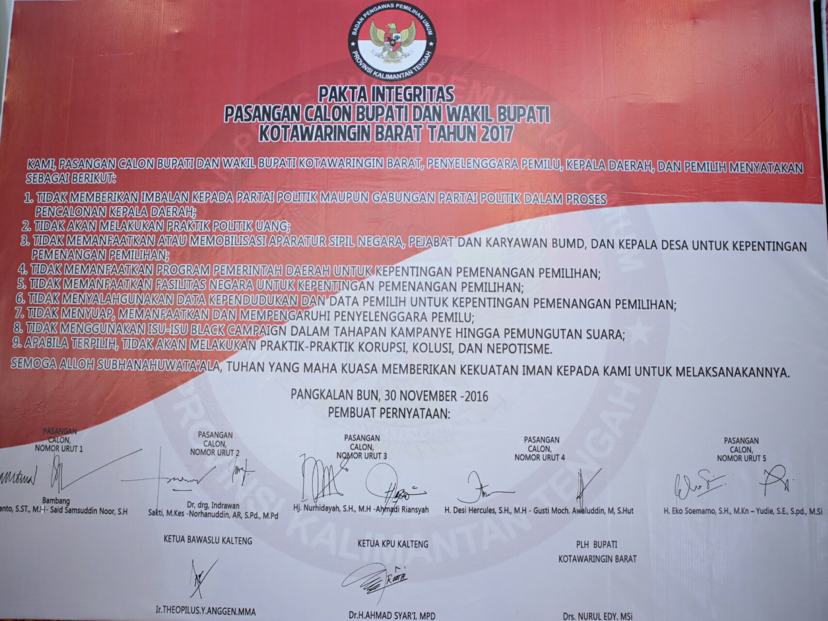 Kotawaringin Barat, Badan Pengawas Pemilu - Lima pasangan calon (Paslon) sepakat menandatangani pakta integritas Pemilihan Bupati dan Wakil Bupati Kotawaringin Barat Tahun 2017. Selain menandatangani pakta integritas, paslon juga menyatakan diri siap menang, siap kalah dan siap menerima hasil pilbup.