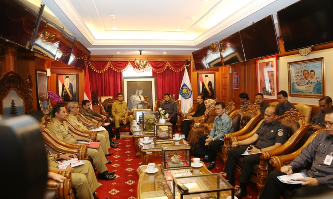 Ketua Bawaslu RI, Muhammad menyampaikan Indeks Kerawanan Pemilihan Gubernur, Bupati dan Walikota Tahun 2017 kepada Menteri Dalam Negeri Tjahjo Kumolo, di Kantor Kemendagri, Jakarta, Senin (22/8).