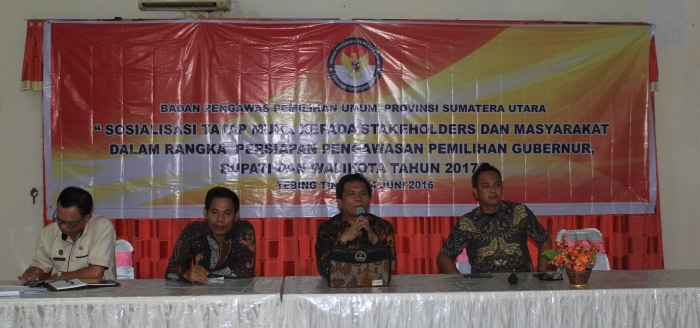 Acara sosialisasi tatap muka dengan stakeholder di Tebing Tinggi dihadiri sedikitnya 100 orang perwakilan dari pemerintah daerah, Panwaslih setempat, aparat keamanaan, kejaksaan, tokoh masyarakat, tokoh agama, perwakilan mahasiswa dan tokoh-tokoh parpol setempat. Tujuannya, untuk memberikan pemahaman masyarakat tentang pilkada dan aturan mainnya serta meningkatkan partisipasi pemilih dalam Pilkada Tebing Tinggi 2017 mendatang.