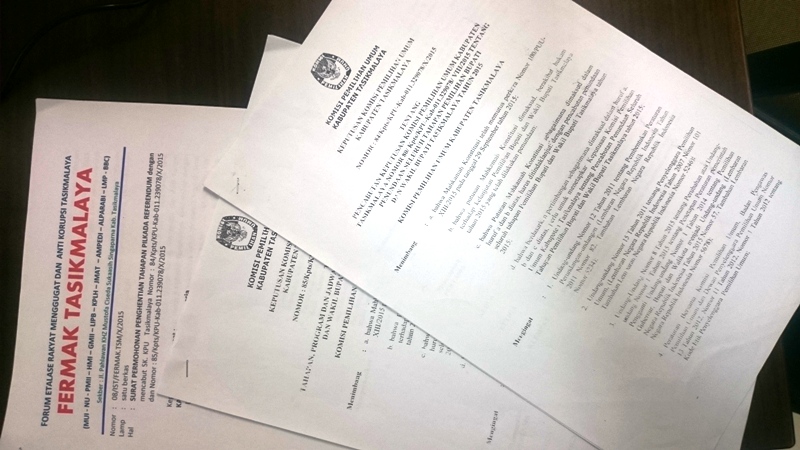Letter from NGO FERMAK on the petition for termination of stages of election for local leaders. They question about the Decree of Election Commission of Tasikmalaya Regency No. 84 / Kpts / KPU-Kab-011.239078 / X / 2015 and No. 85 / Kpts / KPU-Kab-011.239078 / X / 2015 related to the stages of election for local leaders in Tasikmalaya Regency.