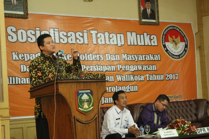 Sarolangun, Badan Pengawas Pemilu- Ketua Bawaslu RI Muhammad menjadi narasumber bersama anggota Koimis II DPR RI Arteria Dahlan serta Pj Bupati Sarolangun Arief Munandar. Kedatangan orang nomor satu di Bawaslu ini dalam rangka sosialisasi dan tatap muka dengan stakeholder dan masyarakat dalam menghadapi Pilkada serentak tahun 2017 yang disiarkan secara langsung oleh RRI Provinsi Jambi.