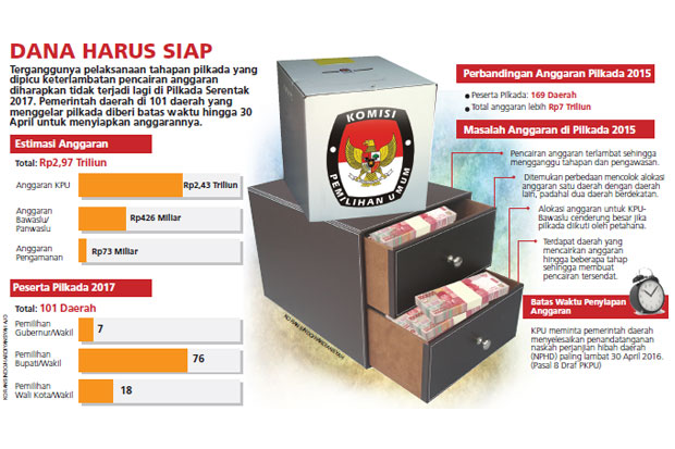 ”Kita mau supaya Kemendagri sebagai leading sector anggaran pilkada benar-benar memberikan arahan kebijakan yang jelas, tegas, dan konkret kepada pemda, tidak multitafsir,” kata Muhammad. Bawaslu juga menemukan fakta ada kepala daerah yang sengaja mencairkan anggaran di akhir-akhir menjelang hari H karena tujuan tertentu. ”Kita tidak mau pengalaman seperti pada 2015 terulang,” ujarnya.