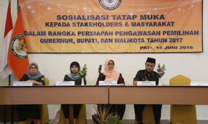 Pati, Badan Pengawas Pemilu – Meski pelaksanaan pemungutan suara Pemilihan Gubernur, Bupati dan Walikota Serentak Tahun 2017 masih terhitung lama, Bawaslu RI beserta seluruh jajaran mulai gencar menyosialisasikan persiapan pengawasan Pilkada. Hari ini, Selasa (14/6) siang menjelang sore, Bawaslu Provinsi Jawa Tengah melaksanakan Sosialisasi Tatap Muka Kepada Stakeholders dan Masyarakat tentang Persiapan Pengawasan Pilkada 2017 di Kabupaten Pati, Jawa Tengah.