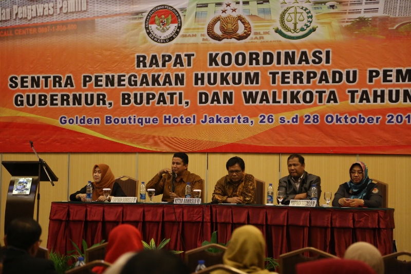 Bertempat di Hotel Golden Boutiqe Jakarta, sekitar 150 peserta yang berasal dari Bawaslu Provinsi dari seluruh Indonesia mengikuti Rapat Koordinasi Sentra Gakkumdu Pemilihan Gubernur, Bupati, dan Walikota Tahun 2015 selama tiga hari sejak Senin (26/10) hingga Rabu (28/10). Dibuka secara resmi oleh Ketua Bawaslu RI Muhammad, acara ini mengundang narasumber dari Bareskrim Polri dan Kejaksaan Agung RI.